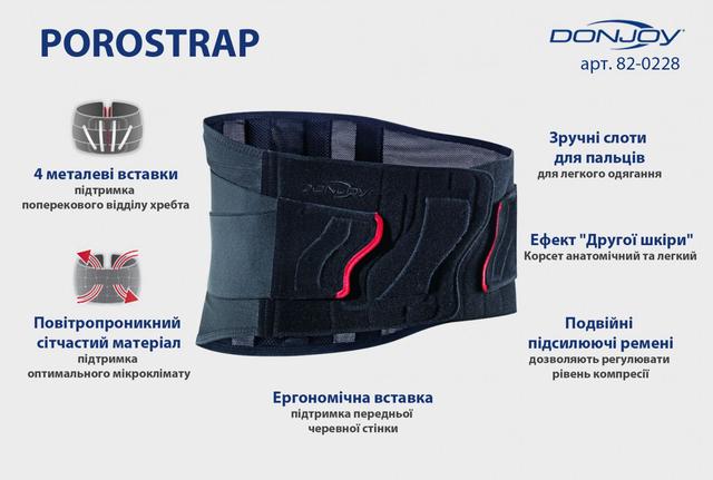Корсет анатомічної форми DonJoy Porostrap виготовлений з еластичного та максимально повітропроникного матеріалу, що створює ефект «другої шкіри». Матеріал підтримує оптимальний мікроклімат та забезпечує підвищений комфорт користувачеві під час тривалого використання.